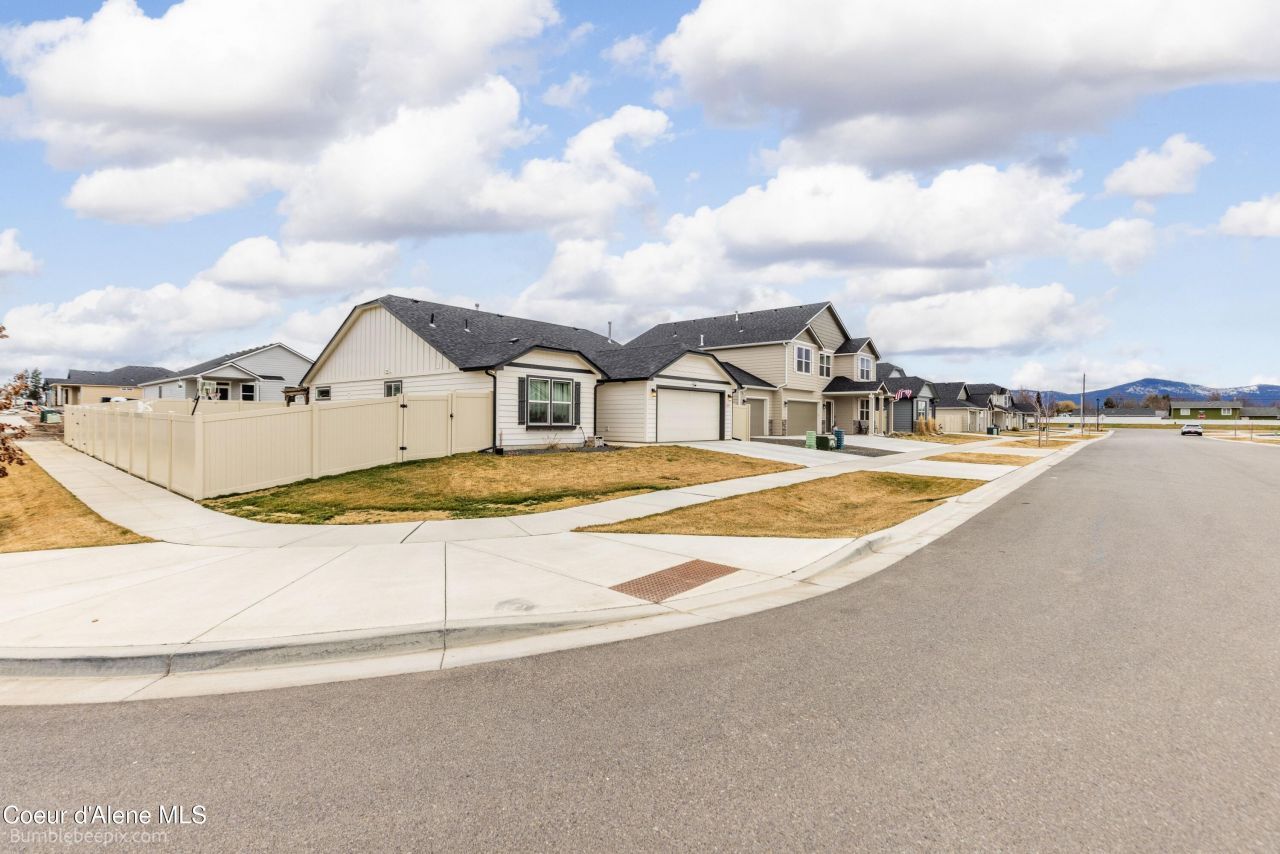 Like new 2024 built home on a desirable corner lot in Post Falls! This bright and modern 3 bedroom, 2 bath, 2 car garage home features quartz countertops throughout, stainless steel appliances, and stylish LVP flooring. Large windows fill the home with natural light, creating a warm and inviting atmosphere. Step outside to a fully fenced backyard with a pergola, perfect for relaxing evenings or entertaining guests. A great opportunity to own a nearly new home with modern finishes and plenty of outdoor space.