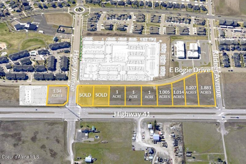 Tullamore Commercial is located approximately 2 miles North of I-90 and fronting the West side of Highway 41 in Post Falls, Idaho. This commercial project is surrounded by high density multi-family, single family and planned commercial adding to its strong development opportunities. A variety of grocery, fitness, dining, medical, shopping, schools and city parks are either planned or already positioned in close proximity. This property is zoned CCM (Community Commercial Mixed). Traffic counts at 19,500 cars a day. The population is expanding at a faster rate than any other location in Kootenai County. Fully engineered lots with all major utilities to the site. This is a unique opportunity to purchase land from ±1.00 - ±8.12 acres within the newly revitalized and improved Highway 41 corridor.